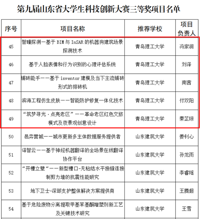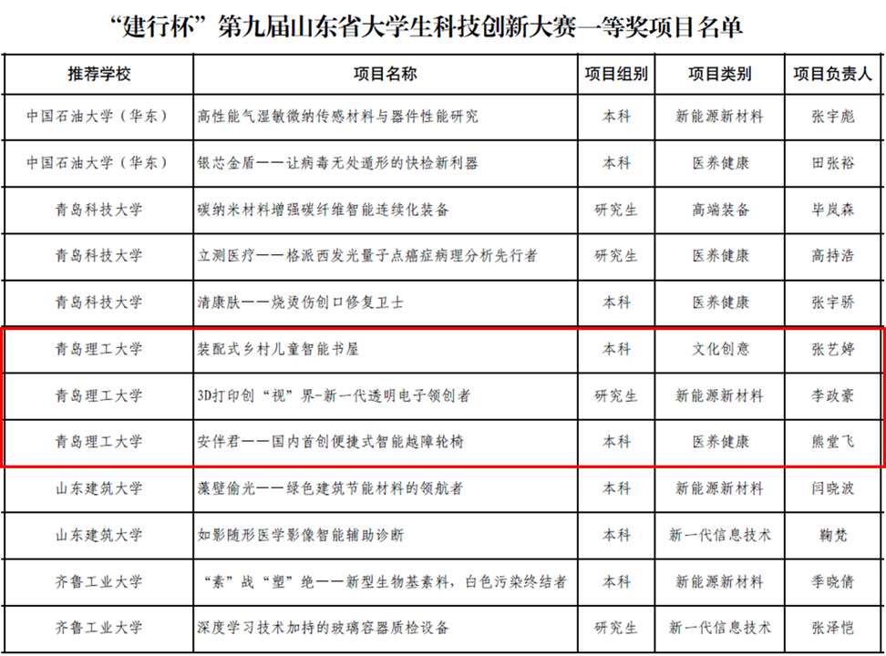 近日,山东省教育厅主办的“建行杯”第九届山东省大学生科技创新大赛决赛落下帷幕,经过激烈角逐,我校建筑与城乡规划学院项目《装配式乡村儿童智能书屋》、机械与汽车工程学院项目《3D打印创“视”界-新一代透明电子领创者》、管理与工程学院项目《安伴君——国内首创便捷式智能越障轮椅》荣获一等奖。