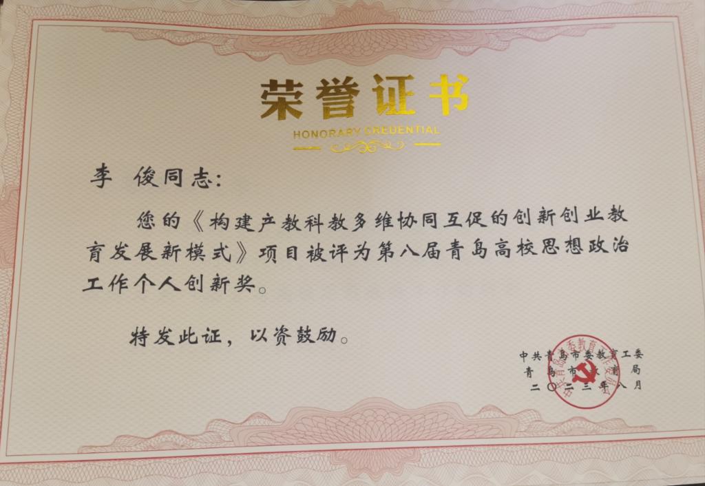 近日,青岛市委教育工委组织开展了第八届青岛高校思想政治工作创新奖评选活动。经各高校推荐申报、专家评委会评审,共30项成果获评思想政治工作集体创新奖、25项成果获评思想政治工作个人创新奖。我院院长李俊申报的《构建产教科教多维协同互促的创新创业教育发展新模式》获评“第八届青岛高校思想政治工作个人创新奖”。