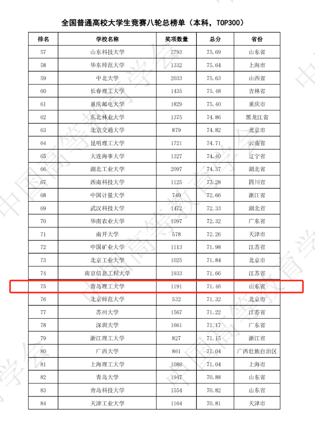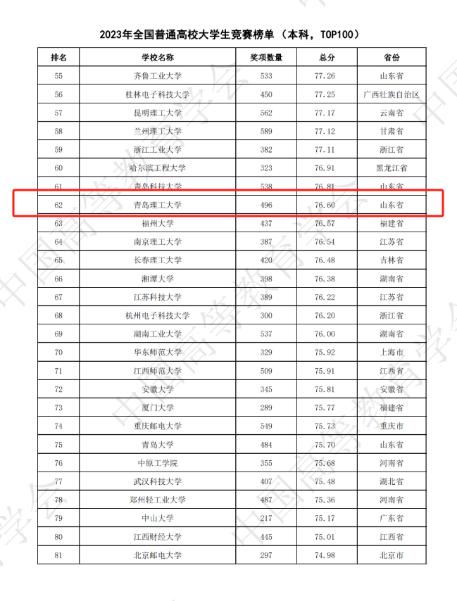 近日,中国高等教育学会高校竞赛评估与管理体系研究专家工作组发布《2023全国普通高校大学生竞赛分析报告》,yl1111永利集团在2023年度全国竞赛榜单(本科,前100)中全国榜获奖数量496项,位居全国62位,较去年提升38个位次,在第八轮全国竞赛总榜单(前300)中获奖数量1191项,位居全国75位,山东省属高校第2名,排名提升4个位次,再创历史新高。