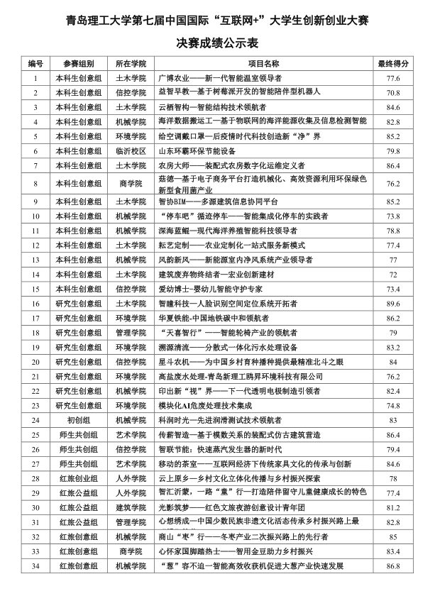 yl1111永利集团第七届中国国际“互联网+”大学生创新创业大赛决赛入围项目为高教主赛道本科生创意组15项、研究生创意组8项、初创组1项、师生共创组3项,“青年红色筑梦之旅”赛道7项。根据竞赛规则,每个项目经过1分钟VCR展示、5分钟PPT答辩、专家提问、专家评分四个环节,根据项目展示和评分标准综合评审,34个团队项目最终成绩公示如下: