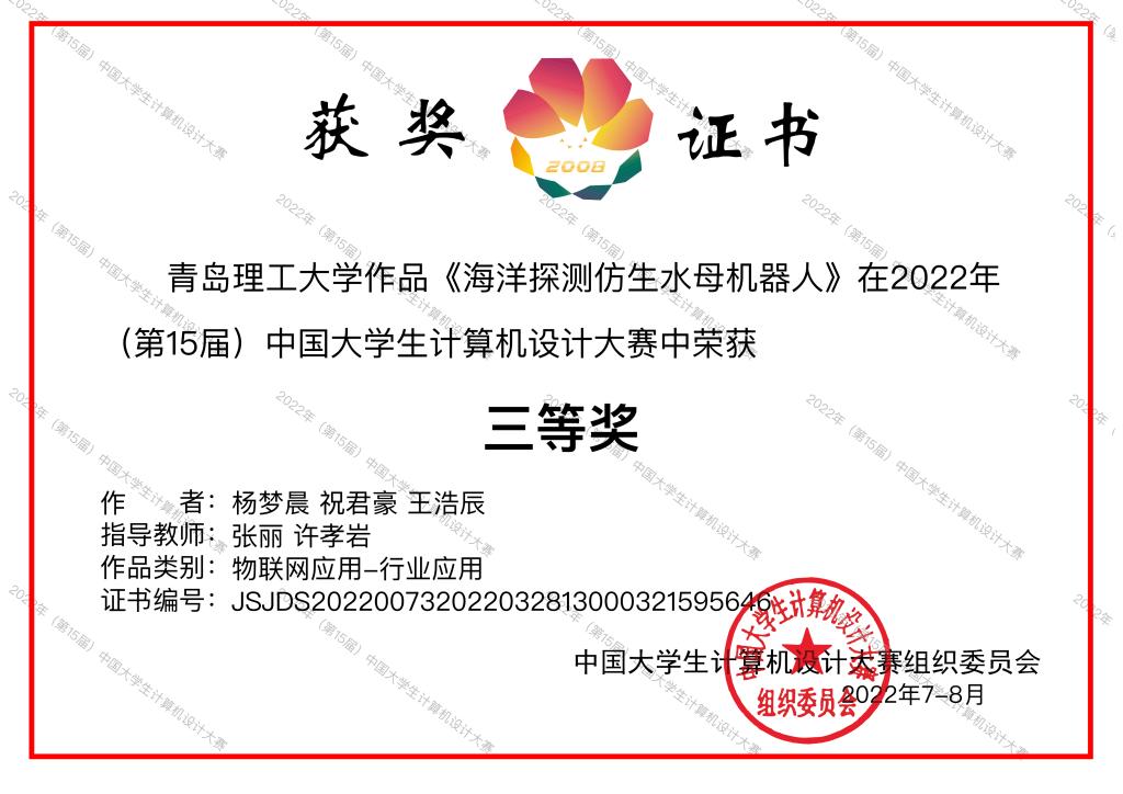 信息与控制工程学院自2022年3月份开始开始宣传动员和组织学生参赛、备赛,5月份选派8项作品参加中国大学生计算机设计大赛山东省级赛的四个类别的比赛,经过激烈的省赛角逐,8项作品全部获奖,3项作品成功上推国赛。经过国赛“初评+复评”和激烈的网络答辩,邵泽楷、裴晓彬同学的作品《智引——老年人智能手机学习助理》(指导老师:吴万春、李兰)荣获软件应用开发组全国三等奖;杨梦晨、祝君豪、王浩辰同学的作品《海洋探测仿生水母机器人》(指导老师:张丽、许孝岩)荣获物联网应用组全国三等奖。