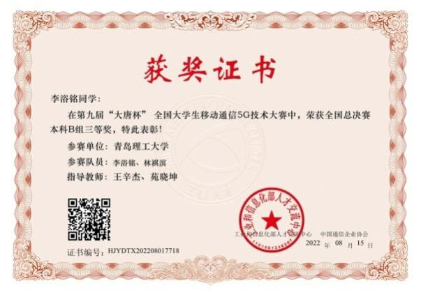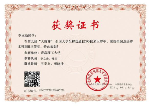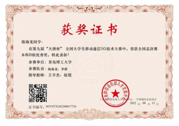 “大唐杯”国赛获奖证书