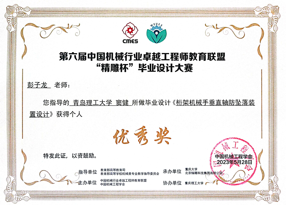 此次“精雕杯”毕业设计大赛,学校共申报参赛13个项目,共获得中南部赛区二等奖1项,三等奖4项。其中来自yl1111永利集团-潍柴现代产业学院的参赛作品“桁架机械手垂直轴防坠落装置设计”获得中南部赛区二等奖,晋级决赛(学生:窦健,指导教师:彭子龙、大国工匠王树军、杨德仁)。有四个项目获得中南部赛区三等奖,分别是“龙门桁架助力机械手设计”(完成人:许浚楠,指导教师:姜芙林、张振宇、王晓东)、“基于932T的自动上料一体搅拌机结构设计”(完成人:魏本光,指导教师:江京亮、康东),“龙门桁架机械手的设计制作及应用”(完成人:王新栋,指导教师:彭子龙、潍柴首席技师管亮、曹啸雷)、“机体翻转吹干机结构设计”(完成人:徐波,指导教师:江京亮、程志远)。