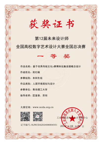 未来设计师·全国高校数字艺术设计大赛(NCDA)是入选《全国普通高校学科竞赛排行榜》,多家教育厅认定,“学习强国”学习平台支持,对接联合国国际赛的全国性大学生竞赛。本届大赛共有1,891所高校参赛,共征集298,763件作品,设立29个省级赛区。艺术与设计学院学院师生参赛团队先后经过校赛、省赛、全国总决赛等多个环节的激烈角逐,最终学院10支参赛队伍脱颖而出,荣获国家级奖项。