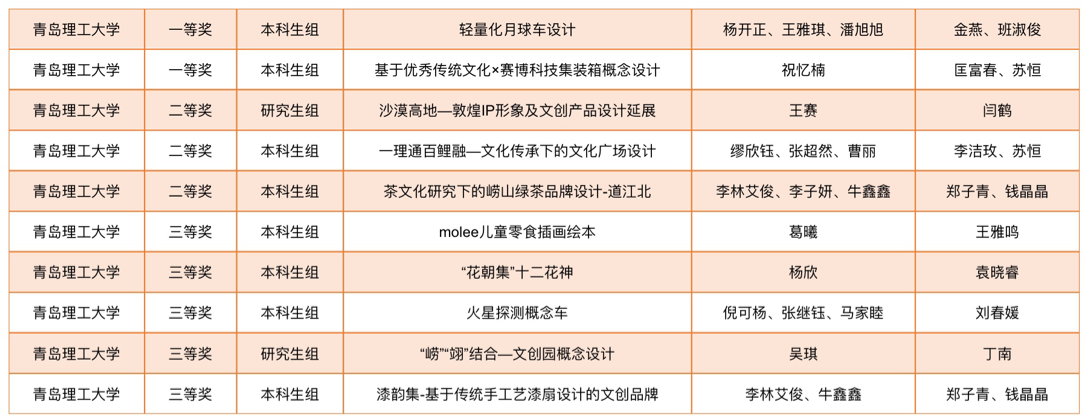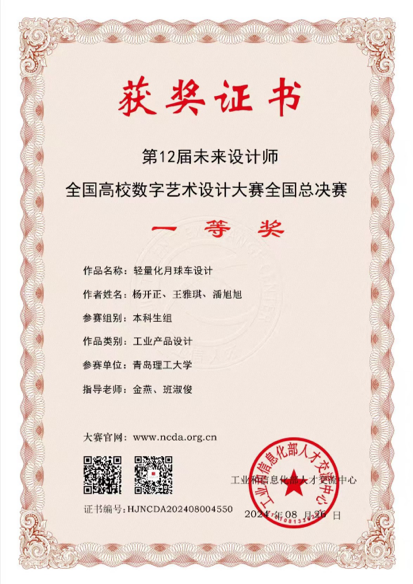 杨开正、王雅琪、潘旭旭团队的参赛作品《轻量化月球车设计》(指导老师:金燕、班淑俊)和祝忆楠的参赛作品《基于优秀传统文化×赛博科技集装箱概念设计》(指导老师:匡富春、苏恒)荣获全国一等奖。此外,另有8支团队分别荣获国家级二等奖与国家级三等奖。这些奖项的获得,不仅彰显了艺术设计学院师生的专业水平,也体现了学院在培养具有创新思维和实践能力人才方面的显著成效。