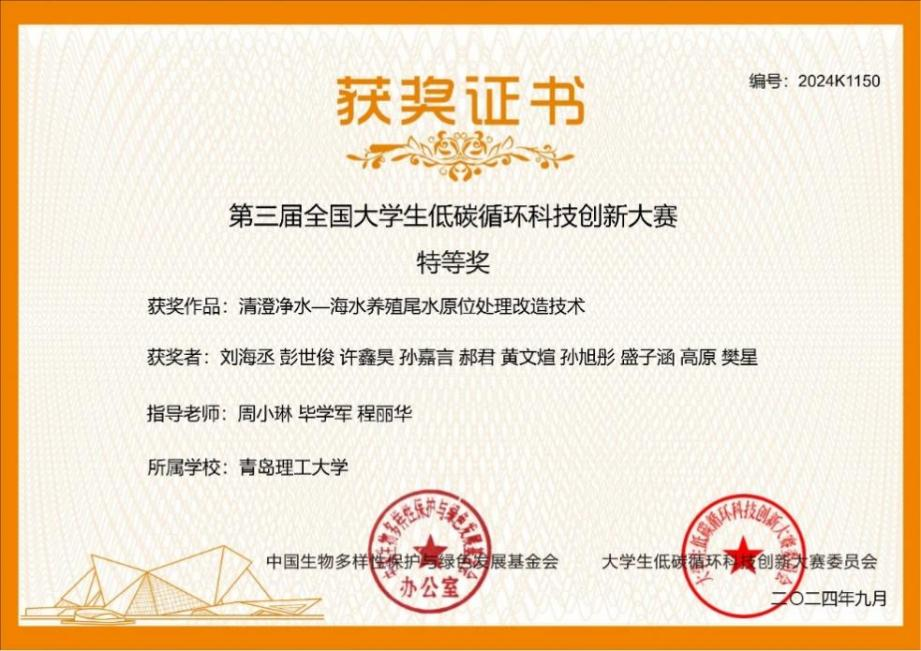 我校参赛项目《清澄净水——海水养殖尾水原位处理改造技术》针对海水养殖尾水处理处所面临的投资高、耗电大、维护难这三大难题,突破创新一种海水养殖尾水原位处理改造技术(海水养殖流化生物膜技术),通过对养殖池塘原有曝气设备进行适宜化改造,可以实现海水养殖尾水的原位处理。该技术能充分降低海水养殖尾水处理成本,有效减少水资源浪费和污染物排放,目前已在山东多户海水养殖场完成应用推广,在推动低碳发展、助力乡村振兴等方面做出了卓越贡献。在全国总决赛的答辩过程中,团队受到了评委专家的高度赞扬和认可,荣获第三届全国大学生低碳循环科技创新大赛中获全国特等奖。