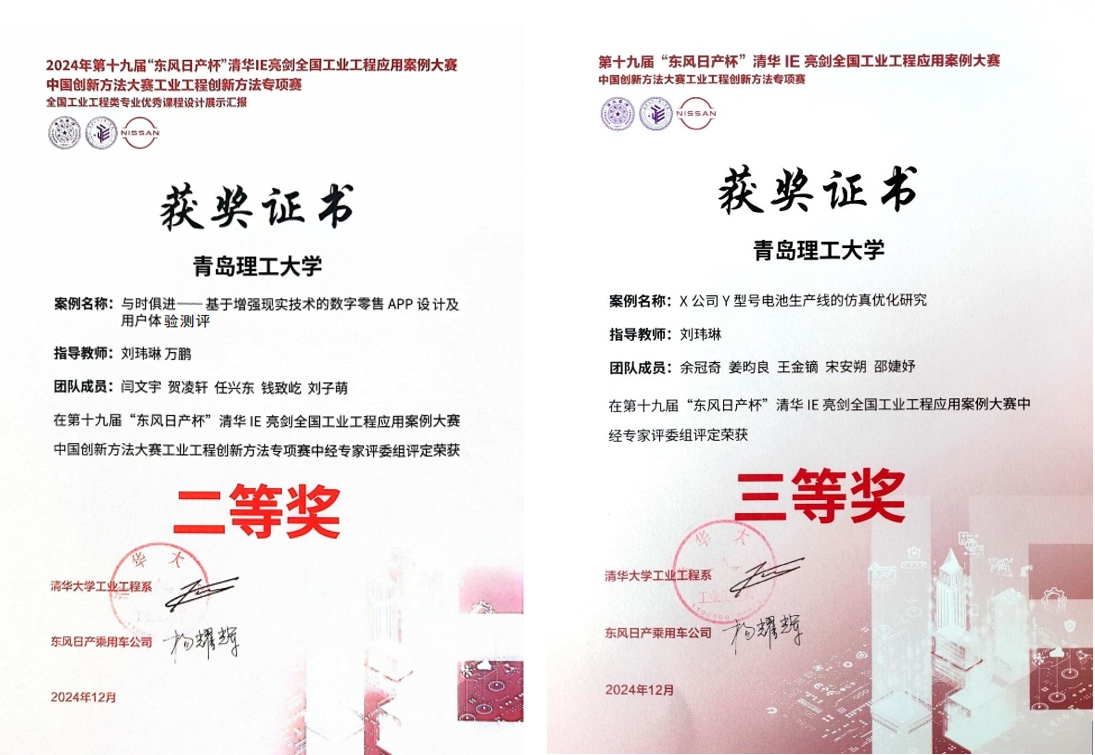 经过专家评审,由刘玮琳和万鹏老师指导的工业工程学生闫文宇、贺凌轩、任兴东、钱致屹、刘子萌,在全国工业工程类专业优秀课程设计展示汇报“人因工程题目”组中,脱颖而出,冲进全国7强,经决赛角逐,最终获得二等奖;由刘玮琳老师指导的工业工程学生余冠奇、王金镝、宋安朔、姜昀良、邵婕妤,在工业工程创新方法专项赛中获得三等奖!