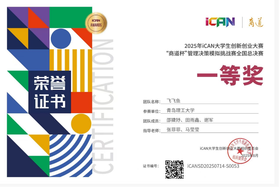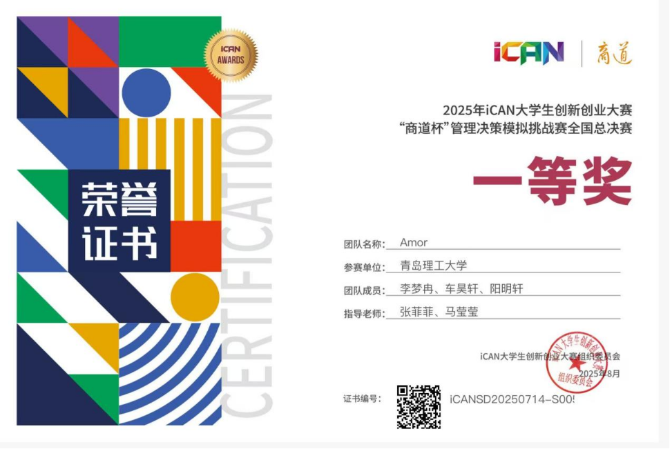近日,2025年iCAN大学生创新创业大赛“商道杯”管理决策模拟挑战赛全国总决赛落下帷幕,管理工程学院工业工程专业张菲菲、马莹莹两位老师指导的飞飞鱼队(邵婕妤、谢军、田雨鑫)和Amor队(李梦冉、阳明轩、车昊轩)斩获2项全国一等奖。