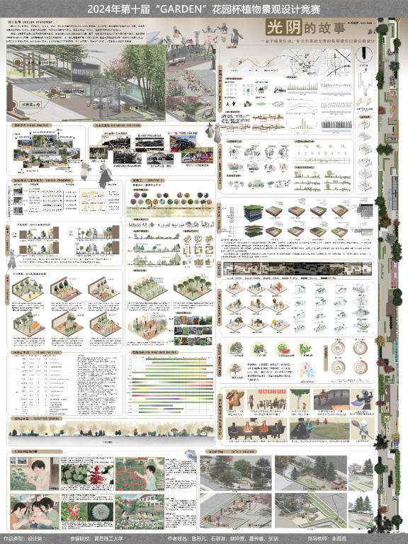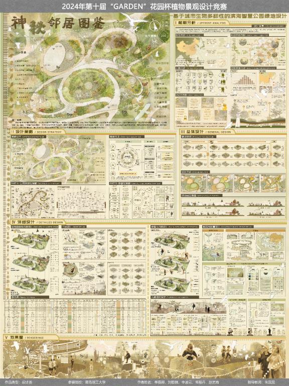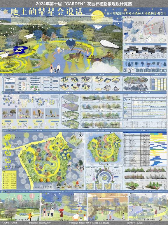 在获奖作品中,多项设计融合创新理念与生态实践,展现出扎实的专业能力和前瞻性的设计思维。由风景园林专业本科生樊雅雯、徐昕宇、庄欣怡、胡晟、韩雪童完成的作品《地上的星星会说话》获二等奖,作品聚焦儿童心理健康,通过植物景观营造舒缓、互动的自然环境,帮助儿童缓解压力、促进情感交流;单嘉卿、刘敬娆、李凌云、常罂丹、赵艺宵完成的作品《神秘邻居图鉴》着眼于城市生物多样性,构建智慧型滨海公园绿地,为野生动植物提供栖息地,增强公众生态意识;鲁思凡、石香淑、储烨雯、董梓睿、张涵的作品《光阴的故事》则以“绿美生活、多元共享”为主题,改造城市闲置空间为多功能口袋公园,融合文化叙事与社区功能,提升城市微空间品质荣获三等奖;苏莹、邓子萱、袁雅莉、周东泽、陈长鑫完成的《浮生三记》基于“三生理念”(生产、生活、生态),对青岛国际邮轮母港港区进行植物景观重构,推动区域生态可持续发展以及姜汝欣、赵白露、邢舒然、张奕帆、王艺萌的作品《梵梵植语》运用TWEP模型,规划青岛自然科普植物园,强化自然教育与公众参与,提升场地科普功能与社会价值,获得优秀奖。