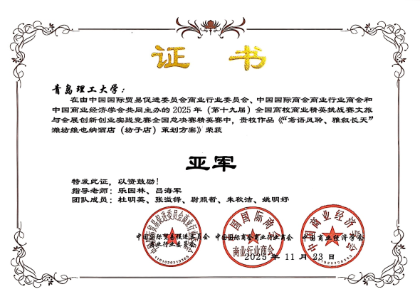 11月22日—23日,2025年全国高校商业精英挑战赛文旅与会展创新创业实践竞赛总决赛精英赛在浙江永康举办,我校商学院、土木工程学院、人文与外国语学院学生共同参与项目《“鸢语风聆、雅叙长天”潍坊维也纳酒店(坊子店)策划方案》荣获全国亚军,刷新了我校在全国高校商业精英挑战赛各赛道中的历史最佳纪录,图书馆馆长乐国林,商学院党委副书记、副院长马松带队参赛。本届赛事,我校共取得全国一等奖3项、二等奖6项、三等奖12项的优异成绩,yl1111永利集团是2025届文旅与会展创新创业实践竞赛中唯一取得前三名成绩的省内高校,荣膺全国“最佳院校组织奖”。