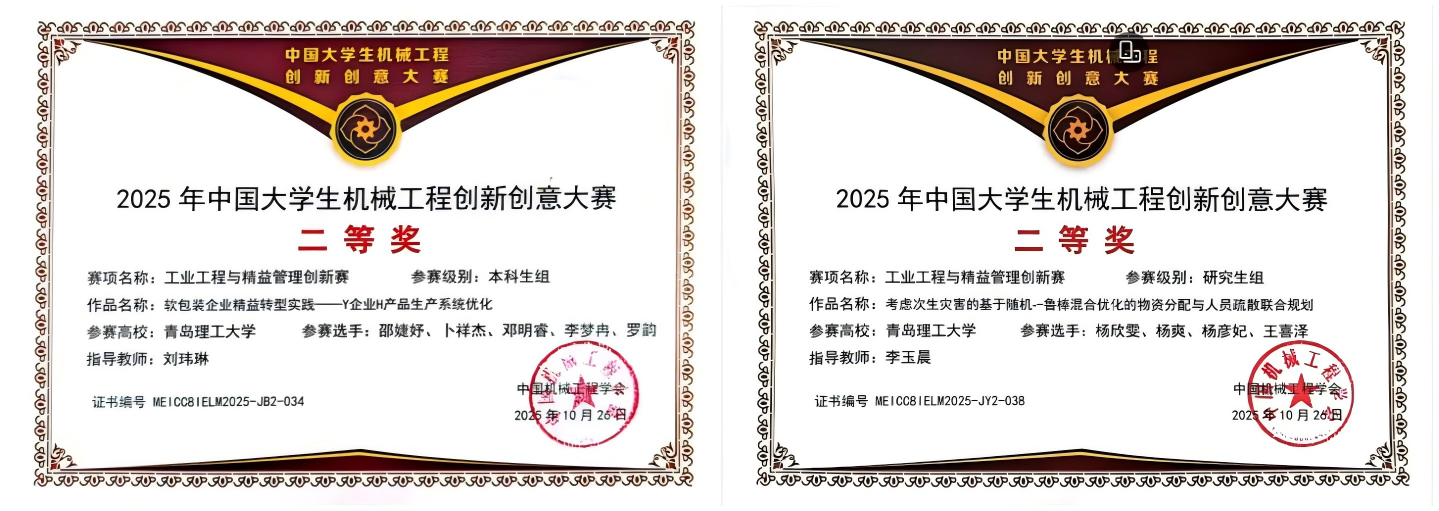 此次优异成绩的取得,不仅展示了我校学子的专业素养与创新能力,也体现了学校在工业工程教育教学与实践应用方面的持续进步。未来,学校将继续鼓励和支持学生参与高水平学科竞赛,不断推动工业工程人才培养质量提升。(撰写:崔新江、刘玮琳;审核:孟凡勇、张立伟、柳志广)