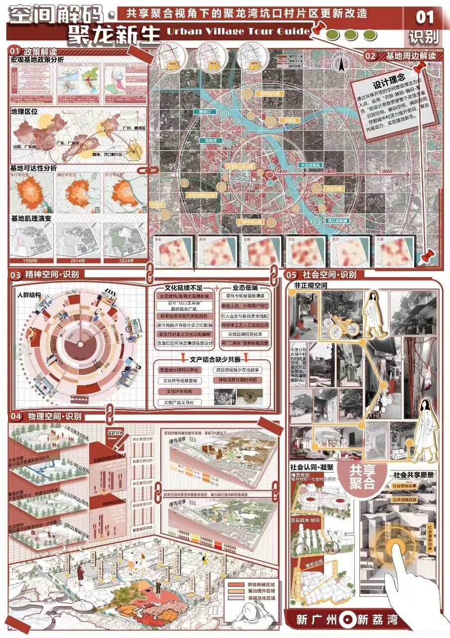 本次获奖团队是在韩青教授的指导下,由吴婷婷、余欢、姚博文、纪航曦、路世杰五位研究生组成。竞赛以“规划引领高质量更新,设计赋能新质生产力”为主题,聚焦“蓝绿融城・产业兴城・文化润城・智慧启城”的设计要求。参赛团队围绕广州市重点功能片区的滨水地块开展深入研究,从空间解码入手,以“共享聚合”为路径,探索功能整合与空间重构,致力于打造“宜居、宜业、宜游”的城市新生空间,充分体现“多规合一”背景下规划与政策融合、科学性与创新性并重的设计理念。